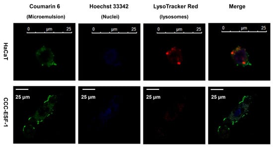 Intracellular localization of coumarin 6-loaded microemulsion in HaCaT and CCC-ESF-1 cells; microemulsion, nuclei, and lysosomes were labeled with coumarin 6 (green), Hoechst 33342 (blue), and LysoTracker Red (red); the yellow shows green (microemulsion) colocalized with LysoTracker Red.