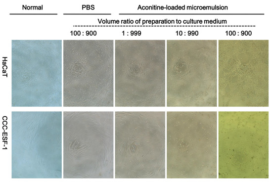 The cell viability results are consistent with the cell morphology observations (Figure 8). In order to evaluate the possible effect on the cells of the dilution of the dispersion medium (PBS) in the microemulsion, an equal volume of PBS as a microemulsion was used as a control group in the experiment. The results showed that the added amount of PBS had no significant effect on cell morphology and growth. At low concentrations, microemulsions without aconitine had slight effects on cell viability, and there was no significant difference compared with the control group (p > 0.05), but as the concentration increased, cell viability gradually decreased. Aconitine exhibited a certain degree of toxicity to the cells. Therefore, after aconitine was loaded, the microemulsion toxicity increased. The cytotoxicity of each aconitine preparation was also concentration-dependent. Compared with the aconitine DMSO solution group, the aconitine microemulsion group produced less cytotoxicity (p < 0.05). In addition, at the same preparation concentration, the CCC-ESF-1 cells exhibited lower viability than the HaCaT cells.