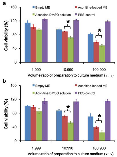 HaCaT (a) and CCC-ESF-1 (b) cell viability after being treated with various preparations for 24 h (ME, microemulsion; PBS-control, PBS without aconitine; * p < 0.05; n = 3).
