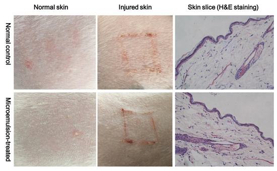 Normal and injured rat skin after being treated with aconitine-loaded microemulsion in vivo once a day for 7 days (H&E, hematoxylinandeosin). Magnification ×400.