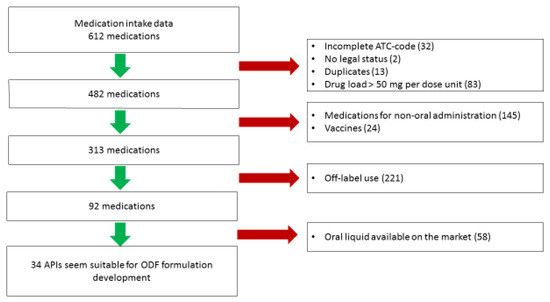 After three exclusion steps, 92 medications were selected for further research. For 58 medications, a commercial oral liquid or an injection fluid (to be used as oral liquid) were available. Oral liquids have, for many years, been the dosage form of choice for pediatrics [27], and for that reason, these 58 medications were not regarded as the first choice for ODF formulation development. However, it is important to keep in mind that oral liquids have limitations, namely: formulations are not suitable for children with fluid restriction; the formulations possess a relatively short shelf life (due to chemical and/or microbiological stability limitations); accurate dosing is not always possible with the use of, e.g., a measuring cup and children may spit out the dose if the smell and taste is not acceptable for them [5,27,28]. Moreover, in case of a shortage of commercially available medications, age-appropriate dosage forms, such as ODFs, can be compounded and tailor-made in a pharmacy.