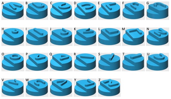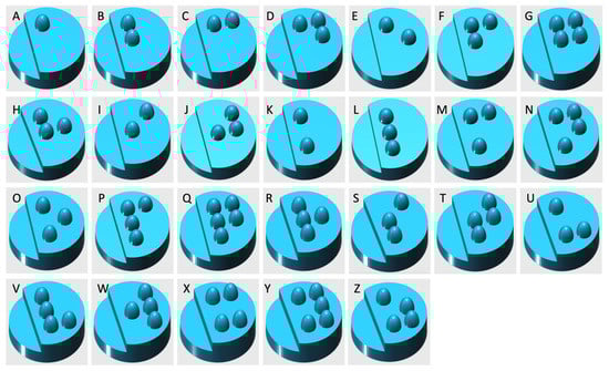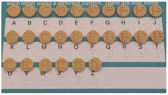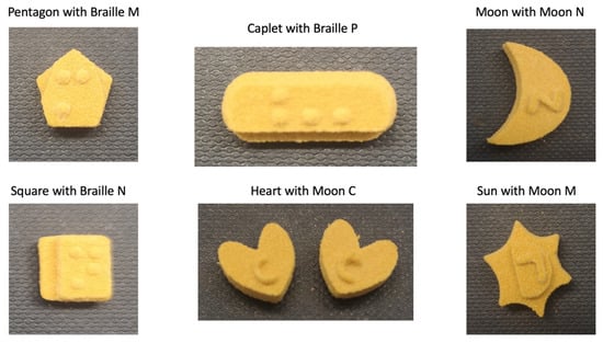 Currently, Braille is the universal tactile writing system used by the blind. It was invented by Louis Braille in 1825 and consists of up to six raised dots (height = 0.5 mm, space in between dots = 2.5 mm) in specific arrangements that represent different letters of the alphabet [6,7]. Another commonly used system is the Moon system, which was developed by William Moon in 1845. It is based on Latin Roman letters produced using raised shapes that are similar to the standard alphabets [8]. Compared to Braille, the Moon system is often considered easier to learn, especially for those who are not familiar with the raised dot patterns [9]. Currently, one approach to help visually impaired patients with medicine identification is the inclusion of Braille on the packaging of a medicinal product. Nonetheless, due to the absence of standardised packaging, patients often struggle to identify medications, especially in the case of generic medicines that could have an entirely different appearance and/or tactile sense (e.g., different size, shape, and/or colour of tablet and different package). Moreover, identification through pharmaceutical packaging becomes less useful when the patient removes the medicine out of its original container [4].