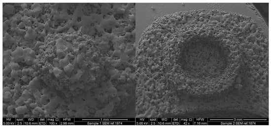Kollidon VA64 was selected as the main polymer matrix due to its good printability and fast disintegration properties as shown in our previous work [56]. The printlets were designed and fabricated to incorporate a small step-down from their left side. As advised by the RNIB, the purpose of this feature was to inform patients the correct direction of reading of the Braille and Moon alphabets (e.g., from left to right), thereby preventing confusion between different letters that have similar patterns. SEM imaging was performed to visualise the microstructure of the polymer particles following their sintering (Figure 5). Results show that, in both the Braille and Moon patterns, Kollicoat IR underwent a low-intensity sintering process. This can be inferred from the distinct particles that can be seen on the surfaces [60].