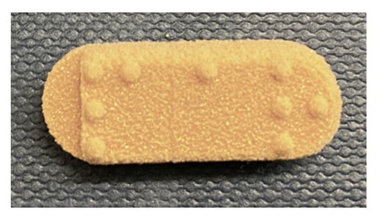 A caplet containing three Braille letters was also designed, further expanding the possibilities with this technology and showing that three-letter abbreviations could be printed onto bigger-sized formulations (Figure 7). Herein, PAR was used as an abbreviation for paracetamol. The distances between the adjacent letters were designed as per the requirements of the UKAAF, wherein the standard distance between two dots within the same letter should be 2.5 mm and the standard distance between the corresponding dots in adjacent letters should be 6 mm [62]. To allow enough space for the inclusion of all the letters, one side of the caplet was designed to be flat.