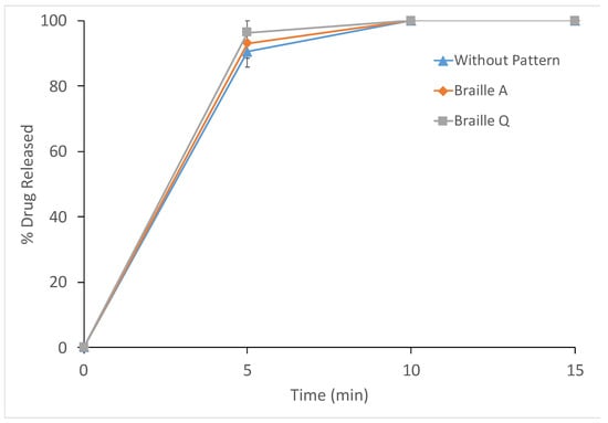 Dissolution studies were also performed using printlets having no pattern and printlets with Braille letters A and Q. The printlets were dissolved in simulated gastric fluids, and the results are shown in Figure 8. The addition of the Braille patterns did not have significant effects on the release rates of the printlets, and the drug release profile in the presence of the Braille patterns was considered similar to the release profile of the reference printlets (no pattern), where ƒ2 similarity values of 84 and 69 were obtained in the presence of the Braille A and Braille Q patterns, respectively.