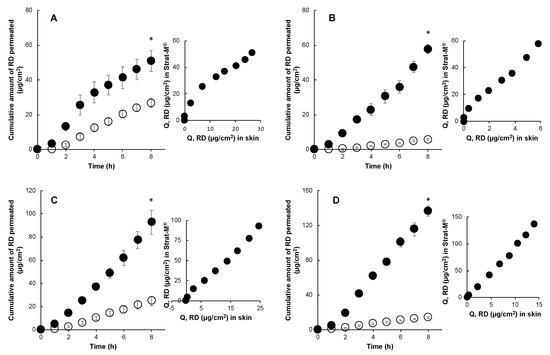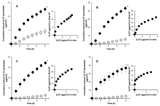 Time course of the cumulative amount of caffeine (CF) that permeated through Strat-M® (●) and porcine skin (○) and their correlations in in-use (finite dose) conditions (10 μL/cm2). 1% CF in water (A), 1% CF in 50% polyol (B), 1% CF in 75% polyol (C), and 1% CF in 100% polyol (D). Each point represents the mean ± S.E. (n = 4). Significant difference (* p < 0.05) between RD permeation through Strat-M® and porcine skin.