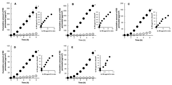 Time course of the cumulative amount of RD that permeated through Strat-M® (●) and porcine skin (○) and their correlations under infinite dose conditions. 1% RD in water (A), 2% RD in 19.5% polyol (B), 2% RD in 40% polyol (C), 2% RD in 61.8% polyol (D), and 2% RD in 100% polyol (E). Each point represents the mean ± S.E. (n = 4). There was a significant difference (* p < 0.05) between RD permeation through Strat-M® and porcine skin.