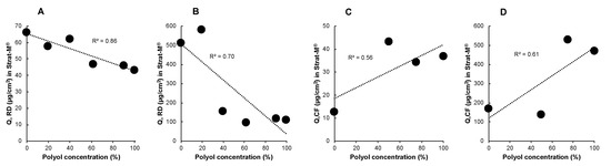 Relationship between permeation through Strat-M® and polyol concentration in RD and CF formulations. Finite dose experiment with RD (A), infinite dose experiment with RD (B), finite dose experiment with CF (C), and infinite dose experiment with CF (D).