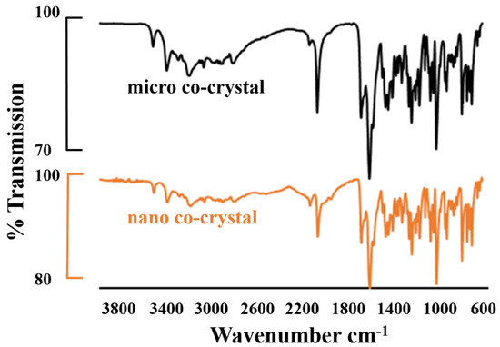 FTIR absorption spectra of the micro (black) and the nano co-crystal (orange).