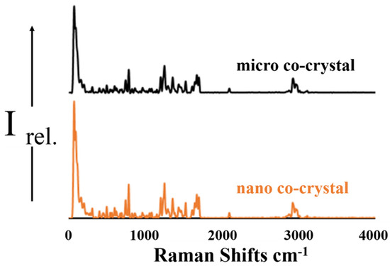 A stacked plot of the Raman spectra for the micro (black) and nano co-crystals (orange).