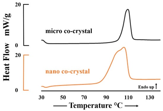 The thermograms depicted in Figure 3 show the melting endotherms of the micro and nano co-crystalline material with Tpeak = 106.7 °C and 103.1 °C respectively. The lower melting temperature and peak broadening for the nano co-crystal is likely due to particle size reduction and is in agreement with the principles of the Van’t Hoff equation [52,53,54]. In addition, slight peak broadening can be attributed to a loss crystallinity and partial formation of amorphous material during the formation of nanosuspensions [55,56].