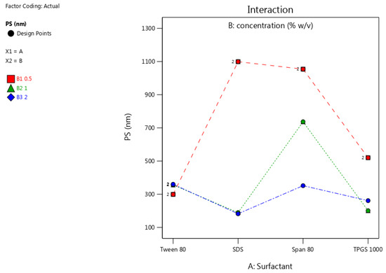 The resultant particle size and PDI of the NCC was smaller when surfactant was used during the sonication phase of the production process. The interaction plots of PS and PDI using different surfactants and concentrations are depicted in Figure 5 and Figure 6.