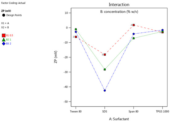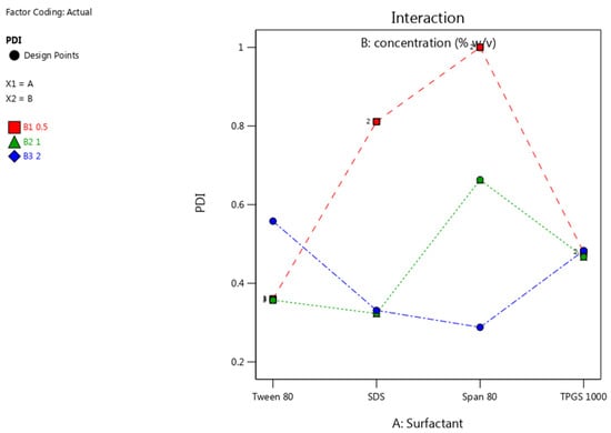 The general trend depicted by the interaction plot for PDI in Figure 6 shows that an increase in concentration results in a lower PDI. As the concentration of each surfactant approached 2% w/v (blue line) the PDI values were lowest. This is attributable to the larg amount of available surfactant to prevent growth at the surface of several nuclei in solution resulting in a more uniform distribution of particle sizes. In addition to affecting the steric layer thickness, molecular weight and chain length; viscosity is also affected [60]. The higher the molecular weight, the higher the viscosity. In the final product, high viscosity can enhance the stability against aggregation [61]. This suggests that the molecular weight of the surfactants not only reduces particle or crystal size and PDI, but could potentially enhance stability.