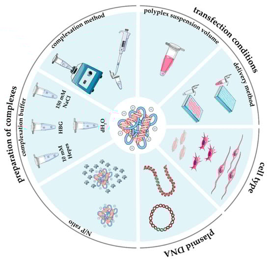 The amount of DNA, and consequently of complexes, to be delivered to cells is a key experimental factor to be taken into account when looking for the best possible transfection outcomes. Although gene delivery experiments are usually carried out over a very narrow range of pDNA doses, the literature agrees on the existence of a causal relationship between the transfection efficiency and the dose of NAs utilized in transfection [137]. Recently, we and others have pinpointed the pDNA dose of 160–320 ng/cm2 as the most effective in different cell lines (HeLa, COS-7, and HepG2 cells) transfected with both PEI isomers [62,137].