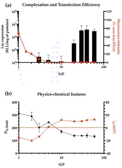 DNA complexation ability, transfection efficiency, and physico-chemical characteristics of pDNA/lPEI complexes prepared in 10 mM Hepes at different N/Ps. (a) Transfection efficiency (black bars) in L929 cells of pDNA/lPEI complexes prepared at different N/Ps. Results are expressed as luminescence signal (RLU) normalized to the total protein content in each cell lysate, and the DNA complexation ability of lPEI (red dots, solid line), evaluated by monitoring the fluorochrome exclusion from complexes as a function of the N/P. (b) Mean hydrodynamic diameter (DH, black dots solid line) and overall surface charge (ζP, red squares and dotted line) of pDNA/lPEI complexes at different N/Ps, as measured by dynamic light scattering (DLS) and electrophoretic light scattering (ELS), respectively. Results are expressed as mean ± SD (n ≥ 3).