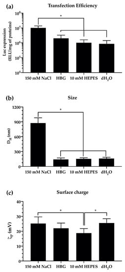 Because non-viral gene delivery particles are formed by electrostatic interactions [111,124], they are sensitive to the composition of the medium (i.e., the saline composition, the ionic strength, and the pH) in which the complexation occurs. The most widely used buffers for complexation are 10 mM Hepes [62,96], whether supplemented or not with 5% (w/v) glucose (hereafter referred to as HBG buffer) [125], 150 mM NaCl [126,127], and deionized water (dH2O or MilliQ) [128].