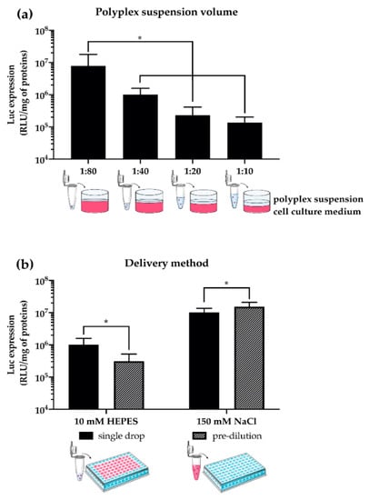 Yet, the way polyplexes are added to cells may also dramatically affect the transfection efficiency. By and large, the delivery of complexes to cells is obtained through the addition of the transfection suspension to the cells cultured in the culture medium [62,96], or the culture vessel in which the cells were plated is emptied, polyplexes are first pre-diluted in the culture medium and then added to the cells [57,64]. As a general observation, lPEI-polyplexes prepared in 10 mM Hepes have smaller DH and are more effective when directly added to the transfection well, while bigger particles (e.g., those prepared in 150 mM NaCl) benefit from the pre-dilution step in cell culture medium before they are incubated with cells (Figure 6b).