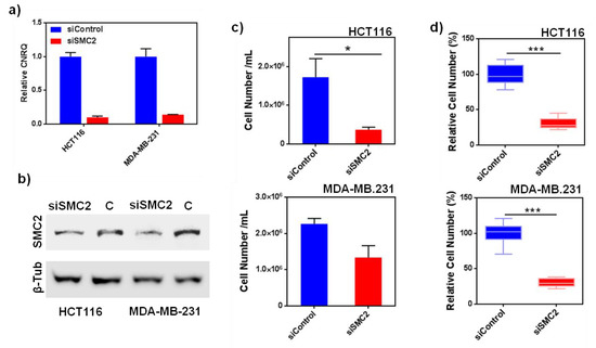 SMC2 siRNA inhibition. (a) Relative mRNA levels after SMC2 silencing for HCT116 and MDA-MB231 cell lines (siSMC2). Fold change is represented with respect to mRNA levels obtained from non-relevant siRNA-treated cells (siControl); (b) SMC2 and beta tubulin proteins detected by Western blot after SMC2 silencing (siSMC2) and compared to non-relevant siRNA-treated cells C; (c) cell viability assay for HCT116 and MDA-MB-231 adherent cells after treatment with siRNA against SMC2 (siSMC2) and with a scrambled control siRNA (siControl); and (d) cell viability assay for HCT116 and MDA-MB-231 growing in non-adherent conditions as tumorspheres, after treatment with siRNA against SMC2 (siSMC2) and with a scramble control siRNA (siControl). * p < 0.05, *** p < 0.001.
