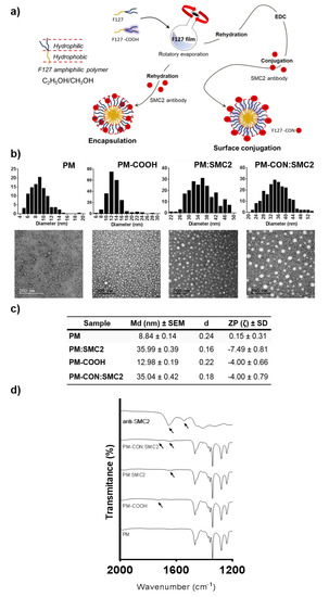 Regarding the antibody loading/association efficiency, it was determined by the measurement of free antibody in the micelle’s supernatant after 300 KDa filtration. PM:SMC2 presented an SMC2 loading efficiency of 68.02% ± 1.01% and PM-CON:SMC2 showed an association efficiency of 61.49% ± 3.11%. Moreover, the loading/association of Ab-SMC2 at the micelles surface were confirmed by FTIR (Figure 2d). Regarding FTIR analysis, control PM-COOH showed a peak at 1727 cm−1 corresponding to the –C=O stretching of the –COOH groups of the carboxylated Pluronic® F127. As expected, this peak is absent in control PM composed only by unmodified Pluronic® F127 [25]. Ab-SMC2 showed a peak at 1654 cm−1 corresponding to the C=O stretching vibrations of the peptide bond of the amide I and also a peak at 1545 cm−1 related to the N–H bending vibration/C–N stretching vibration of the amide II [29].