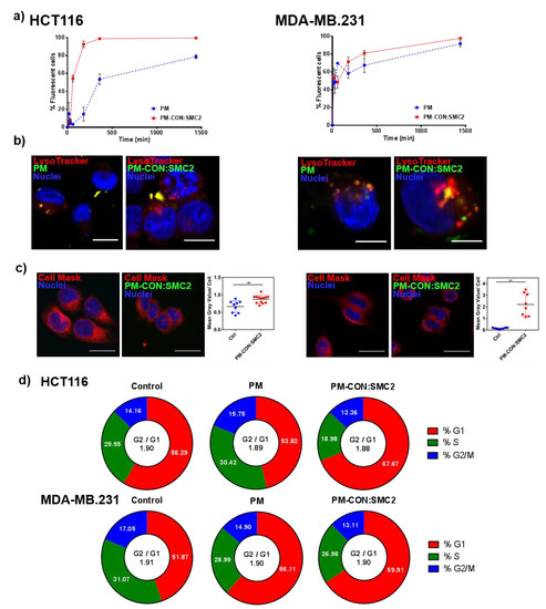 Cellular internalization and intracellular localization assessment of PM decorated with Ab-SMC2 were carried out at several time-points by flow cytometry. Accordingly, 5-DTAF fluorescently labeled PM-CON:SMC2 were incubated with HCT116 and MDA-MB-231 cells. Figure 4a shows that the conjugated nanoparticle (PM-CON:SMC2) presented a faster uptake profile than PM in both cell lines. Further, we could also observe that the MDA-MB-231 cell line exhibited faster uptake profiles than HCT116 cells, which indicates that internalization efficiency is largely dependent on the cell type.