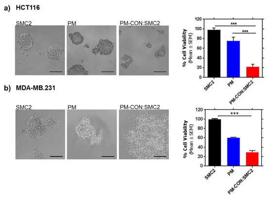 PM-CON:SMC2 in vitro efficacy in CSC. Left panels, microscopy images of HCT116 (a) and MDA-MB-231 (b) tumorspheres after treatment with Ab-SMC2 (6.58 µg/mL), control PM (1 mg/mL of Pluronic® 127) and PM-CON:SMC2 (6.58 µg/mL of antibody and 1 mg/mL of Pluronic® 127). Scale bar correspond to 100 µm. Right panels represent cell viability assays in HCT116 and MDA-MB-231 spheres growing for 7 days in non-adherent conditions. *** p < 0.001.