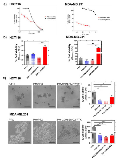 In the clinical setting, PTX and 5-FU are often used in combined chemotherapeutic regimens against breast and colon cancer, respectively. Because a combination of different chemo-therapeutic drugs is commonly endured to improve clinical outcomes, we tested the cytotoxic activity of PM-CON:SMC2 loaded with either PTX or 5-FU anti-tumor drugs for combined treatments. For this, we took advantage of the amphiphilic nature of Pluronic® 127. Thus, while Ab-SMC2 remained conjugated onto the PM surface, we were able to encapsulate these drugs into the hydrophobic core of the resulting PM. Interestingly, when looking respectively at the efficacy of 5-FU and PTX as free drugs in regular cell cultures of HCT116 and MDA-MB-231 in comparison to cells growing as tumorspheres (non-attachment), we observed that both drugs were significantly more active against adherent cells than against tumorspheres (Figure 6a). Tumorsphere resistance was noticeable for 5-FU in HCT116 at concentrations up to 1 µM. In the case of MDA-MB-231, tumorspheres showed resistance to PTX at all tested concentrations, including the highest one (10 µM) (Figure 6a, right panel). These results are in accordance to the CSC-like phenotype associated with tumorsphere growth and more specifically to the described drug resistance capacity of CSC.