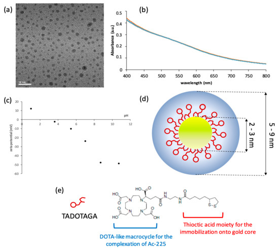 (a) TEM micrograph of Au@TADOTAGA nanoparticles; (b) UV-visible spectra recorded at pH 3 (blue curve), 5 (red curve), 7 (green curve), 9 (purple curve) and 11 (cyan curve); (c) zeta potential of an aqueous suspension of Au@TADOTAGA nanoparticles as a function of pH; (d) schematic representation of an Au@TADOTAGA nanoparticle (yellow: gold core; red: TADOTAGA molecules in the organic shell; blue: the immobile solvatation layer); (e) chemical structure of TADOTAGA.