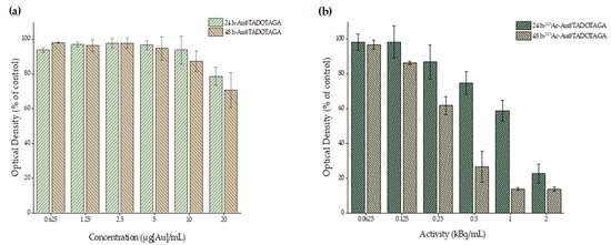 Figure 2 summarizes the results of the cell toxicity studies in U-87 MG cell line after 24 and 48 h of exposure to different concentrations of Au@TADOTAGA and [225Ac]225Ac-Au@TADOTAGA complexes. As can been seen in Figure 2a, after 24 and 48 h of exposure with Au@TADOTAGA, no major changes in the cell viability were recorded at concentrations up to 10 µg/mL. At the highest concentration (20 µg[Au]/mL), a reduction of approximately 22% for 24 h (viability of 88%) and 20% for 48 h (viability of 80%) on the cell viability was observed. On the other hand, treatment with [225Ac]225Ac-Au@TADOTAGA (Figure 2b, molar activity of [225Ac]225Ac-Au@TADOTAGA: 2 kBq/20 μg[Au]) significantly decreases the viability of U-87 MG cells in a concentration-dependent manner after 24 h of incubation, starting from the concentration of 0.5 kBq/mL and reaching a value of 22% (~77% reduction) at the concentration of 2 kBq/mL. A similar trend in a more pronounced manner was observed after 48 h of incubation, since the recorded values of cell viability gradually decreased from 96% to 13% (87% reduction at the highest concentration). Furthermore, the recorded reduction started at a lower concentration (0.25 kBq/mL).
