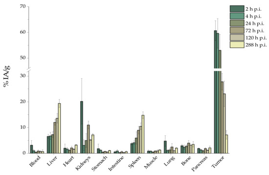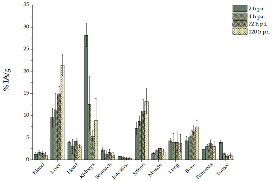 Intravenous administration of [225Ac]225Ac-Au@TADOTAGA was monitored over a period of 120 h p.i. (Figure 3). This study demonstrated that the NPs accumulated mainly in the kidneys, liver and spleen. At 2 h p.i, uptake in the kidneys was 28.21% ± 2.64% IA/g, which decreased in time (8.88% ± 5.03% IA/g at 120 h p.i.), thus reflecting renal clearance. Liver and spleen uptake showed an opposite trend, with 9.50% ± 2.14% IA/g and 7.20% ± 1.42% IA/g at 2 h, which at 120 h increased to 21.46% ± 2.44% IA/g and 13.27% ± 2.93% IA/g, respectively. Tumor radioactivity peaked at 2 h p.i. (4.05% ± 0.34% IA/g) and exhibited a 4-fold decrease by 120 h p.i., remaining practically stable after 4 h p.i. Bone uptake showed a gradual increase from 2 to 120 h p.i. (4.38% ± 1.02% to 7.48% ± 1.36% IA/g). No major uptake in other organs is noted.
