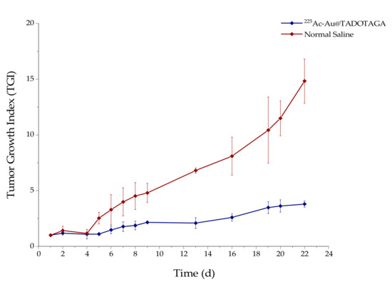 Effect of intratumoral injection of [225Ac]225Ac-Au@TADOTAGA (blue line) or normal saline (red line) on the tumor growth index (TGI) of U-87 MG tumor-bearing SCID mice. Values represent the mean ± SD (n = 5 mice per group).