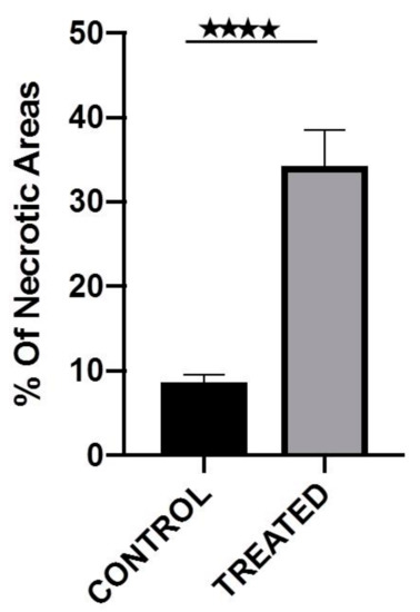 Percentage of the total necrotic areas per tumor. The 4 stars indicate the p value. p < 0.0001.