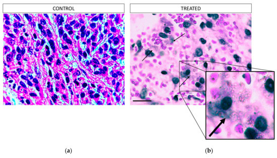 Representative images of H&E-stained slices of U-87 MG tumor tissue after the therapeutic efficacy study in mice, from the area of the necrotic lesion (100× magnification): (a) control mice, (b) treated mice. The arrows indicate the presence of nanoparticles in periphery of the necrotic lesions of the treated tumors. The box shows a 5× digital zoom of the selected area. Scale bar = 40 μm.