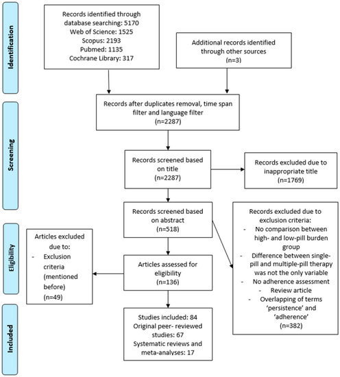 Articles were included in the systematic review if they were either original peer-reviewed studies or systematic reviews and meta-analyses. Narrative reviews and conference abstracts were excluded. There were no restrictions concerning the type of patients, diseases, comorbidities, or drugs. Adherence was the only essential outcome measure for an article to be considered, regardless of how it was measured. Other outcomes were not assessed. All articles needed to have a comparison between low and high pill burden groups, meaning that one group had to take more pills than another group. This was possible either with control groups (longitudinal, controlled) or when observing one group with patients who changed their pill burden over time (longitudinal, uncontrolled). It was also necessary that the articles dealt with solid dosage formulations rather than with any other dosage form.