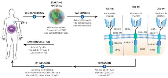 The CAR gene-modified T cells are then expanded ex vivo and prepared as a pharmaceutical intravenous infusion product. The cells are usually administered as single infusion. The median time from leukapheresis to CAR-T-cell administration is 4–5 weeks and the entire process from referral to infusion can take up to 2 months []. Therefore, physicians often perform bridging chemotherapy to avoid rapid disease progression and to maintain the patient’s general condition during the CAR-T-cell production period. Lymphodepleting (LD) chemotherapy, such as fludarabine and cyclophosphamide, is often administered prior to the infusion of the CAR-T cells (Figure 1) []. LD chemotherapy decreases the number of T cells in vivo, including regulatory T cells, and consequently upregulates cytokines such as IL-7 and IL-15 []. These cytokines promote T-cell expansion and augment the anti-tumor activity of the CAR-T cells.