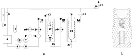 Schematic diagram of the supercritical antisolvent (SAS) device (a) and the nozzle (b). (1) CO2 cylinder; (2, 14, 15, 19, 21, 23, 24, 26, and 27) valves; (3) check valve; (4) CO2 cooler; (5) liquid solution supply; (6) liquid pump; (8) CO2 pump; (7 and 9) flow meter; (10, 13 and 20) heat exchangers; (11, 12, and 25) filters; (16) nozzle; (17) stainless steel frit vessel of 200 nm; (18) precipitation chamber; (22) gas–liquid separation chamber.