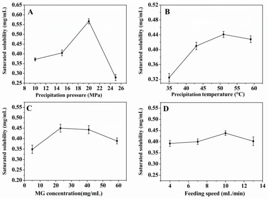 The influence of different preparation conditions on the saturated solubility of the MG MPs was shown in Figure 3. From Figure 3A, it can be seen that when the precipitation pressure increased from 10 to 20 MPa, the saturated solubility of the MG MPs increased significantly. When the precipitation pressure was 20 MPa, the saturated solubility of the MG MPs reached the maximum value. But when the precipitation pressure was higher than 20 MPa, the saturated solubility of the MG MPs began to decrease; From the Figure 3B, when the precipitation temperature increased from 35 to 59 °C, the saturated solubility of the MG MPs first increased significantly and then decreased slightly. When the precipitation temperature was 51 °C, the saturated solubility of the MG MPs reached the maximum value; In the Figure 3C, with the MG concentration increasing from 5 to 23 mg/mL, the saturated solubility of the MG MPs began to increase. But when the MG concentration was more than 23, the saturated solubility of the MG MPs decreased gradually. When the MG concentration was 23, the saturated solubility of the MG MPs was the highest. In addition, from Figure 3D, it can be seen that the saturated solubility of the MG MPs increased first and then decreased with increasing the feeding speed from 4 to 13 mL/min. When the feeding speed was 10 mL/min, the saturated solubility of the MG MPs reached the maximum value.
