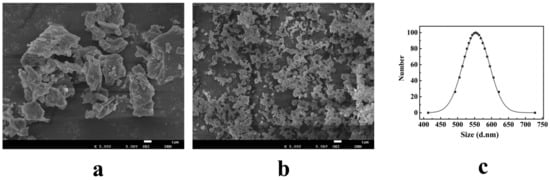 Figure 4a shows the SEM image of the free MG. It could be seen from the image that the free MG was irregular long flake shape, and its particle size was greater than 10 μm; Figure 4b shows the SEM image of the MG MPs. It could be seen from the image that the particle size and the particle morphology of the MG MPs prepared by the SAS method have been significantly improved, and its morphology was nearly spherical and homogeneously distributed around 0.4–0.7 μm, and was significantly smaller and more uniform than the free MG.