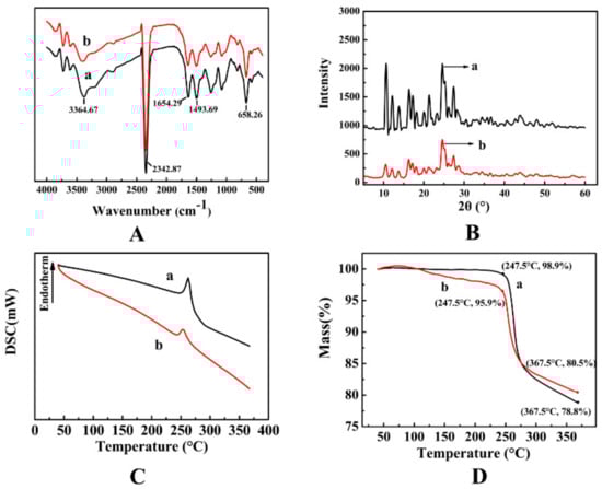 FTIR results (A) (Wavenumber: 400–4000 cm−1), XRD results (B) (2θ = 5–60°), DSC results (C) (Temperature range: 30–370 °C) and TG results (D) (Temperature range: 30–370 °C) of the samples. (a) the free MG; (b) the MG MPs.