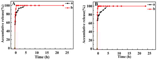 Furthermore, the MG MPs significantly improved drug dissolution compared to the free MG. The dissolution curves of the MG MPs (a) and the free MG (b) in AGJ and AIJ are shown in Figure 7. In the AGJ (Figure 7A), the maximum dissolution of the MG MPs reached 100% at approximately 0.75 h. However, only 83.75% of the free MG dissolved during the same period. In addition, in the AIJ (Figure 7B), the MG MPs achieving the maximum dissolution was approximately 100% at approximately 0.5 h. The dissolution of the free MG was approximately 76.96%. It can be seen that the dissolution rate of the MG MPs was obviously faster than that of the free MG, and was 1.19 times and 1.30 times that of free MG in AGJ and AIJ, respectively. Therefore, the MG MPs prepared was beneficial to improve the solubility and the dissolution of the MG by the SAS method.