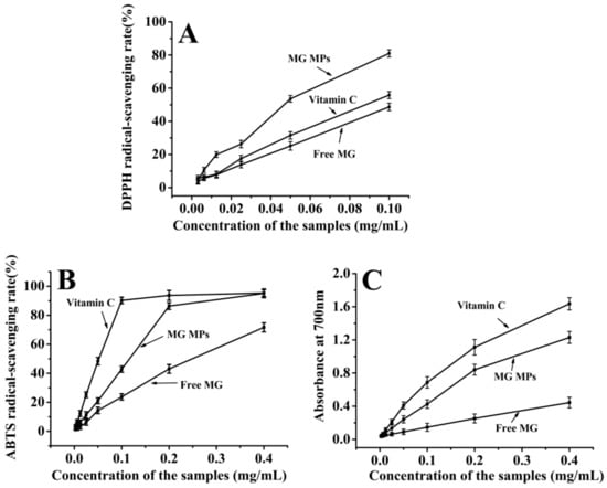 The test of the DPPH radical-scavenging ability is an important method to investigate the antioxidant capacity of the drugs. As shown in Figure 8A, the DPPH radical-scavenging activities of all the samples increased with the concentrations. When the concentration of the samples was 0.025 mg/mL, the scavenging efficiency of vitamin C as control group was about 17.51%, the scavenging efficiency of the free MG was about 13.87%, while the scavenging efficiency of the MG MPs was about 26.31%; when the concentration of the samples reached 0.1 mg/mL, the scavenging efficiency of vitamin C was about 55.84%, the scavenging efficiency of the free MG was about 48.71%. However, the scavenging efficiency of the MG MPs was about 81.01% at the same concentration, which was about 1.66 times of the free MG and 1.45 times of vitamin C. In addition, from the half inhibition concentrations (IC50) of the samples, the IC50 of the vitamin C, the free MG and the MG MPs was about 0.114 mg/mL, 0.148 mg/mL and 0.040 mg/mL, respectively, which showed that the MG MPs had a higher DPPH radical-scavenging activity by lower IC50 than the free MG and the vitamin C.