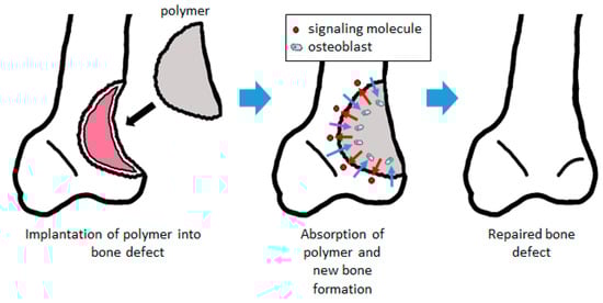 When a biodegradable polymer is implanted into a bone defect as a scaffold enhanced with signaling molecules to promote bone formation, the cells differentiate into bone and are induced and expanded by the signaling molecules released from the polymer. As the autologous bone is regenerated by these cells, the polymer is degraded and replaced by new bone to repair the bone defect (Figure 1).