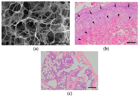 Our experiment on the ectopic bone formation in the dorsum of mice with collagen-based scaffolds. (a) Scanning electron microscope image of a freeze-dried collagen scaffold. Scale bar, 50 μm. (b) Histopathological image at one week after surgery. The collagen is combined with recombinant human bone morphogenetic protein-2 (rhBMP-2) and transplanted onto the dorsal muscle fascia of mice. Collagen fibers (arrow heads) remained, while woven bones (arrows) were formed around the fibers. Scale bar, 200 μm. (c) At three weeks after surgery, no collagen fibers were observed, and mature bones consisting of cortical bone, cancellous bone, and bone marrow tissue were formed. Scale bar, 200 μm.