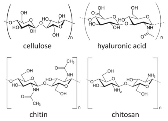 A schematic diagram of some bio-based polymers: cellulose, hyaluronic acid, chitin, and chitosan. Images are modified from a study by Younes et al. [64].
