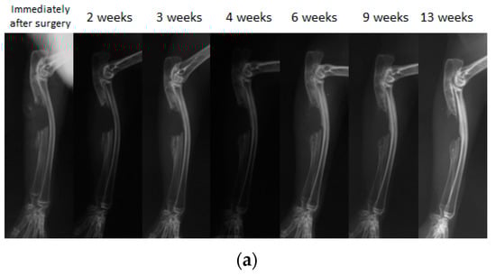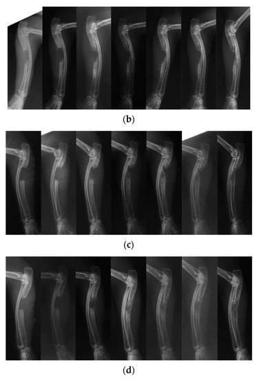 Because biodegradable synthetic polymers can degrade through hydrolysis and get absorbed in vivo, synthetic polymers are gaining popularity as scaffold material for bone regeneration. We have previously developed and reported on a biodegradable polymer that combines poly lactic acid-p-dioxanone-polyethylene glycol block copolymer (PLA-DX-PEG) and rhBMP-2, and observed its biodegradable properties in vitro (Figure 5). The PLA-DX-PEG implant was combined with rhBMP-2 to produce a composite implant, and we observed ectopic bone formation in the dorsal fascia of a mouse model [79]. In addition, we produced a critical-size bone defect in the ulna of a rabbit and transplanted a PLA-DX-PEG implant containing rhBMP-2. The implants were implanted in 1-cm-distance rabbit ulnar bone defects, and these defects were examined after 2, 3, 4, 6, 9, and 13 weeks using radiographical methods. In the control group with defects that were not filled with the implant, the defects were not repaired at three months postoperatively (Figure 6a). The bone defects were also not repaired in the group with PLA-DX-PEG implants alone (Figure 6b) and the group with PLA-DX-PEG implants combined with a small quantity of rhBMP-2 (Figure 6c). In the group with PLA-DX-PEG implants with a large quantity of rhBMP-2, the bone defect was repaired at two months (Figure 6d). Because PLA-DX-PEG implants alone have low osteoconductivity, signaling molecules such as rhBMP-2 are required to repair large bone defects. Using a PLA-DX-PEG implant as a scaffold, we observed that the repair of the bone defect and its strength are dependent on the dose of rhBMP-2.