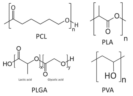A schematic diagram of some synthetic polymers: polycaprolactone (PCL), poly-l-lactic acid (PLA), polylactic-co-glycolic acid (PLGA), and poly (vinyl alcohol) (PVA).