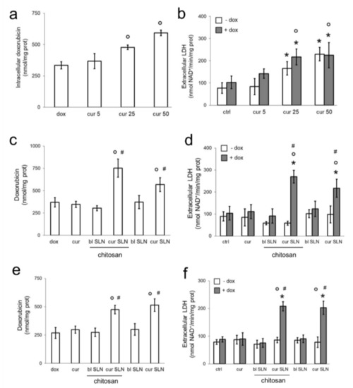 Dose-dependent effects of free CURC and CURC-loaded SLNs on doxorubicin accumulation and cytotoxicity in MDA-MB-231 and JC cells. MDA-MB-231 (panels (a–d)) and JC (panels (e,f)) cells were incubated for 24 h with fresh medium (ctrl) or with the 5–25–50 μM CURC (cur), in the absence (−) or presence (+) of 5 μM doxorubicin (dox). (a) Intracellular doxorubicin was measured fluorimetrically in duplicates. Data are presented as means ± SD (n = 3). ° p < 0.01: vs. dox. (b) The release of LDH in the extracellular medium was measured spectrophotometrically in duplicates. Data are presented as means ± SD (n = 3). * p < 0.05: vs. untreated cells (ctrl); ° p < 0.05 vs. dox-treated cells. (c,d) MDA-MB-231 cells were incubated 24 h with fresh medium (ctrl), 5 μM CURC (cur), blank SLN (bl SLN), CURC-loaded SLN (cur SLN, containing 5 μM cur), with or without chitosan. When indicated, 5 μM doxorubicin (dox) was added. (c) Intracellular doxorubicin was measured fluorimetrically in duplicates. Data are presented as means ± SD (n = 3). ° p < 0.001: vs. dox; # p < 0.001 vs. cur. (d) The release of LDH in the extracellular medium was measured spectrophotometrically in duplicates. Data are presented as means ± SD (n = 3). * p < 0.001: vs. ctrl; ° p < 0.001: vs. dox; # p < 0.001 vs. cur. (e,f) JC cells were incubated as reported in panels C–D. (e) Intracellular doxorubicin was measured fluorimetrically in duplicates. Data are presented as means ± SD (n = 3). ° p < 0.001: vs. dox; # p < 0.001 vs. cur. (f) The release of LDH in the extracellular medium was measured spectrophotometrically in duplicates. Data are presented as means ± SD (n = 3). * p < 0.001: vs. ctrl; ° p < 0.001: vs. dox; # p < 0.001 vs. cur.