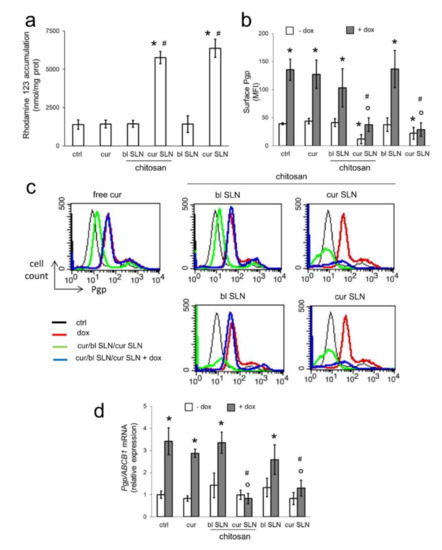 Effects of CURC-loaded SLNs on Pgp activity and expression. MDA-MB-231 cells were incubated for 24 h with fresh medium (ctrl), with 5 μM CURC (cur), blank SLN (bl SLN), CURC-loaded SLN (cur SLN, containing 5 μM cur), and with or without chitosan. When indicated, 5 μM doxorubicin (dox) was added. (a) The Pgp substrate rhodamine 123 was added in the last 20 min. The intracellular accumulation of rhodamine 123 was measured fluorimetrically in duplicates. Data are presented as means ± SD (n = 3). * p < 0.001: vs. ctrl; # p < 0.001 vs. cur. (b) Pgp on cell surface was measured by flow cytometry; results were expressed as mean fluorescence intensity (MFI). Measurements were performed in triplicate. Data are presented as means ± SD (n = 3). * p < 0.01: vs. ctrl; ° p < 0.001: vs. dox; # p < 0.001 vs. cur. (c) Representative histograms of one out of three experiments. (d) The expression of the Pgp mRNA was measured by qRT-PCR in triplicates. Data are presented as means ± SD (n = 3). * p < 0.01: vs. ctrl; ° p < 0.001: vs. dox; # p < 0.001 vs. cur.