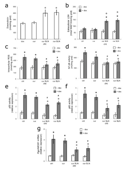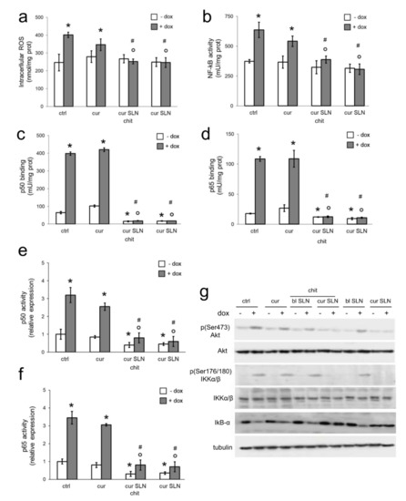 Effects of CURC-loaded SLNs on intracellular ROS, NF-kB activation, and NF-kB-mediated Pgp transcription. MDA-MB-231 cells were incubated with fresh medium (ctrl), 5 μM CURC (cur), and CURC-loaded SLN (cur SLN, containing 5 μM cur), with or without chitosan. When indicated, 5 μM doxorubicin (dox) was added. (a) ROS levels were measured fluorimetrically in triplicates. Data are presented as means ± SD (n = 3). * p < 0.05: vs. ctrl; ° p < 0.001: vs. dox; # p < 0.01 vs. cur. (b) NF-kB activation was measured by ELISA in duplicates. Data are presented as means ± SD (n = 3) * p < 0.05: vs. ctrl; ° p < 0.001: vs. dox; # p < 0.01 vs. cur. (c,d) The binding activity of p50 and p65 was measured by ELISA in duplicates. Data are presented as means ± SD (n = 3). * p < 0.001: vs. ctrl; ° p < 0.02: vs. dox; # p < 0.01 vs. cur. (e,f) The binding of p50 or p65 to mdr1 promoter was measured by ChIP. The immunoprecipitated DNA was amplified by qRT-PCR in triplicates and quantified. Data are presented as means ± SD (n = 3). * p < 0.01: vs. ctrl; ° p < 0.001: vs. dox; # p < 0.01 vs. cur. (g) Cells were lysed and probed with the indicated antibodies. Tubulin was used as the control of the equal protein loading. The figure is representative of one out or three experiments with similar results.