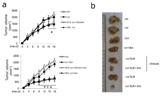 Effects of CURC-loaded SLNs against drug-resistant JC tumors. JC cells were orthotopically implanted into 6 week-old female balb/C mice. When the tumor reached the volume of 50 mm3, mice (n = 8 mice/group) were randomized and treated, as reported in the following groups, on day 1, 7, and 14 after randomization: (1) Vehicle group (ctrl), treated with 200 µL saline solution intravenously (i.v.); (2) CURC group (cur), treated with 5 mg/kg CURC, dissolved in 200 µL water/10% v/v DMSO solution i.v.; (3) doxorubicin group (dox), treated with 5 mg/kg doxorubicin, dissolved in 200 µL water i.v.; (4) CURC + doxorubicin group (cur + dox), treated with 100 µL of water/10% v/v DMSO solution containing with 5 mg/kg CURC + 100 µL water solution containing 5 mg/kg doxorubicin; (5) CURC-CS-SLN group, treated i.v. with 200 µL of saline solution of the indicated SLNs containing 5 mg/kg CURC; (6) CURC-SLN group, treated i.v. with 100 µL of saline solution of the indicated SLNs containing 5 mg/kg CURC + 100 µL water solution containing 5 mg/kg doxorubicin; (7) CURC-SLN group, treated i.v. with 100 µL of saline solution of the indicated SLNs containing 5 mg/kg CURC; and (8) uncoated/CURC-loaded SLN + doxorubicin group (cur SLN + dox), treated i.v with 200 µL of saline solution of the indicated SLNs containing 5 mg/kg CURC + 100 µL water solution containing 5 mg/kg doxorubicin. (a) Tumor growth was monitored daily by caliper measurements. Data are presented as means ± SD. * p < 0.01: vs. ctrl; * p < 0.001: vs. dox; # p < 0.001: vs. cur. (b) Photographs of representative tumors of each group.