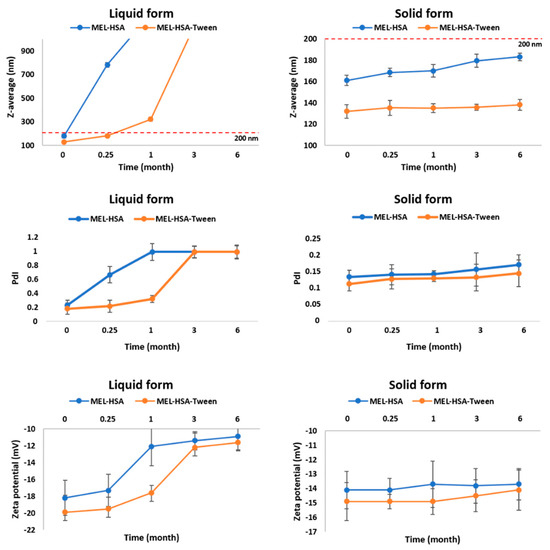 For physical stability investigations at 5 ± 3 °C, MEL-HSA and MEL-HSA-Tween formulations were prepared both without freeze-drying (liquid form) and with freeze-drying (solid form). The results of the physical stability investigations are presented in Figure 5. The Z-average, PdI, and zeta potential of the liquid and solid forms after reconstitution with purified water were determined at the given time points.